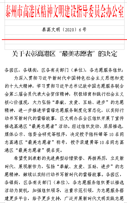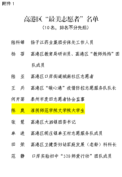 自新冠肺炎疫情暴发以来,众多的77779193永利官网学子主动请缨、勇于担当,积极参加阻击疫情的志愿服务活动,用行动诠释着77779193永利官网学子的服务奉献精神,践行着淮师青年的责任与担当。其中,77779193永利官网1904班陈奥同学以不畏艰难、敢于冲锋的志愿精神与细致耐心、温暖亲切的服务表现,被泰州市高港区文明办评为疫情防控“最美志愿者”。